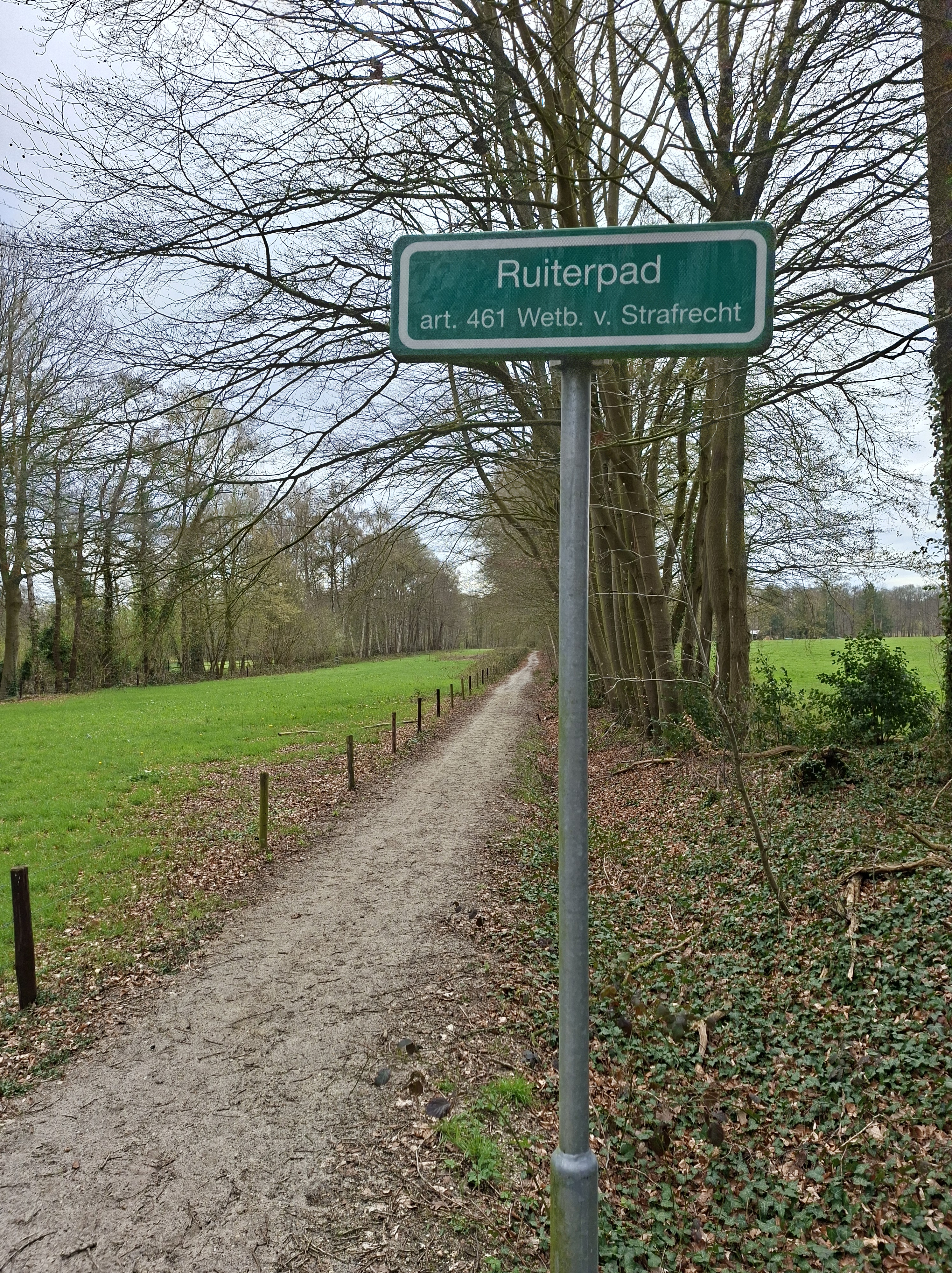 En misschien ook wel door het volgende bord. Ik kan er niets mee. Een Ruiterpad, waar je op moet met een paard, maar een stokpaard verboden is? Als je je er als wandelaar vervoegd, ben je schuldig en het stalen ros is helemaal verboden? Of juist niet. Misschien is hier ook een lid van de koninklijke familie weer de planologie aan het beïnvloeden. Wie weet. De kleur van het bord, kleurt wel lekker met het jonge gras, dat dan weer wel.