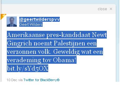 De bijbehorende link heb ik proberen te openen, maar kwam niet veel verder. Voor mijn mijn verbijstering doet dit niet ter zake. Het gaat om de inhoud van het tweetje. ‘Amerikaanse pres-kandidaat Newt Gingrich noemt Palestijnen een verzonnen volk. Geweldig wat een verademing tov Obama!’
