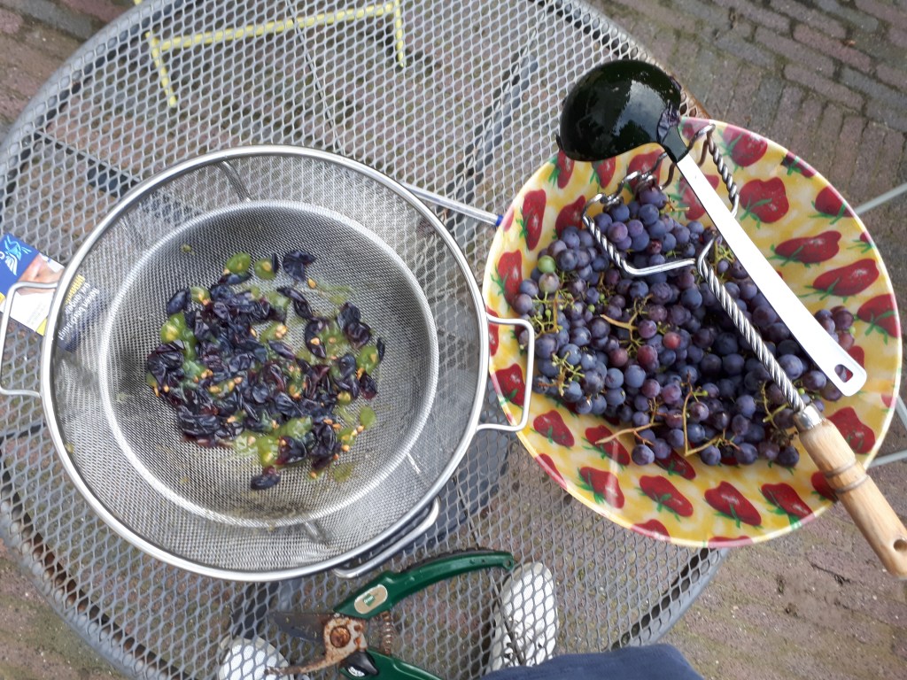 Ik ben niet handig, ik denk te weinig groen of in kringlooptuinbouw, zelfs houd ik veel meer van bier dan van wijn. Toch drong bij mij vandaag de gedachte op iets aan verspilling te doen, of beter gezegd, tegen verspilling. Tijdens het tuinieren lonkten de druiven. Ze wilden geplukt worden.