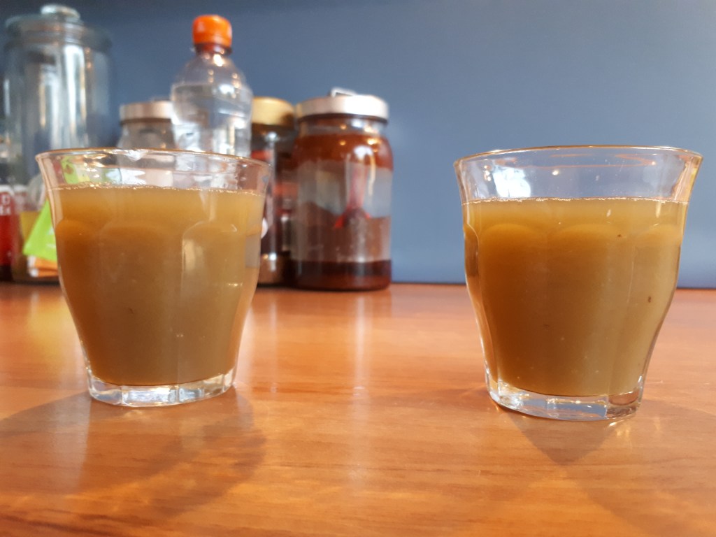 Het was even een werkje, maar na een klein half uur had ik vier overheerlijke glaasjes druivensap. Maar het zag er niet uit zoals ik me had voorgesteld. Een dieppaarse substantie was het niet, integendeel. Troebel en bruingeel, je kunt je amper voorstellen dat de vader en moeder een rode druif waren.