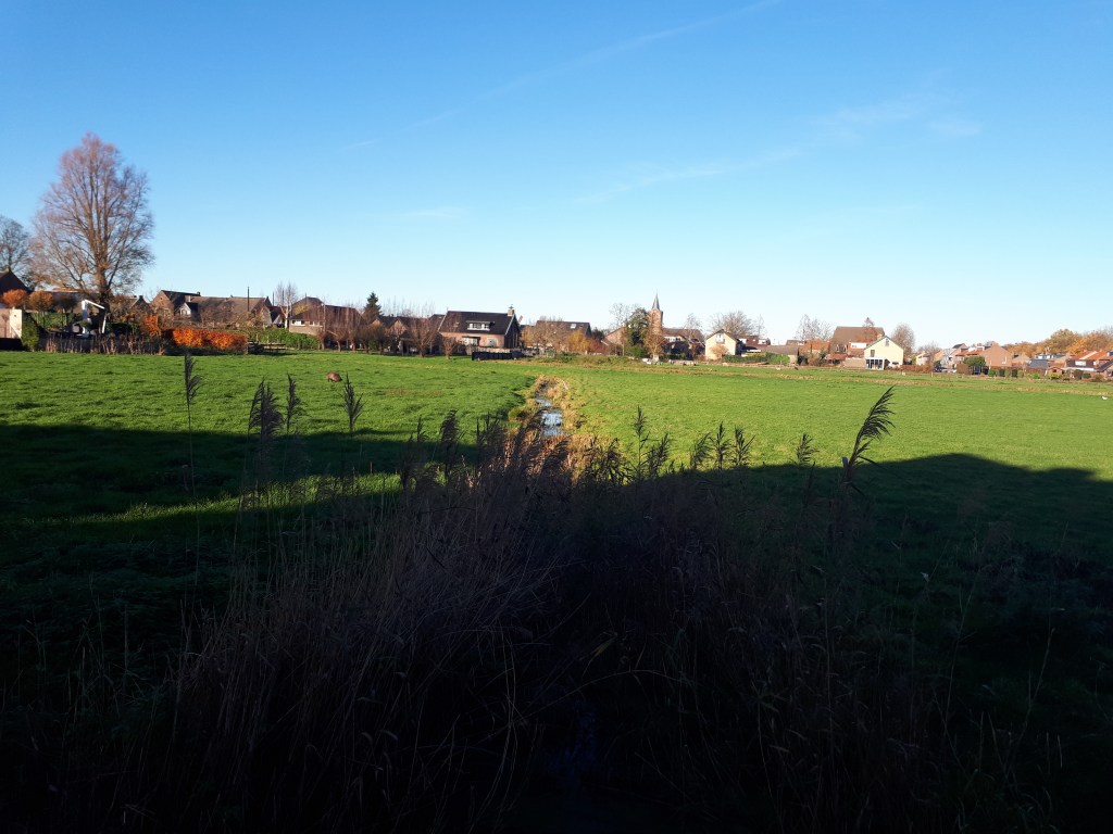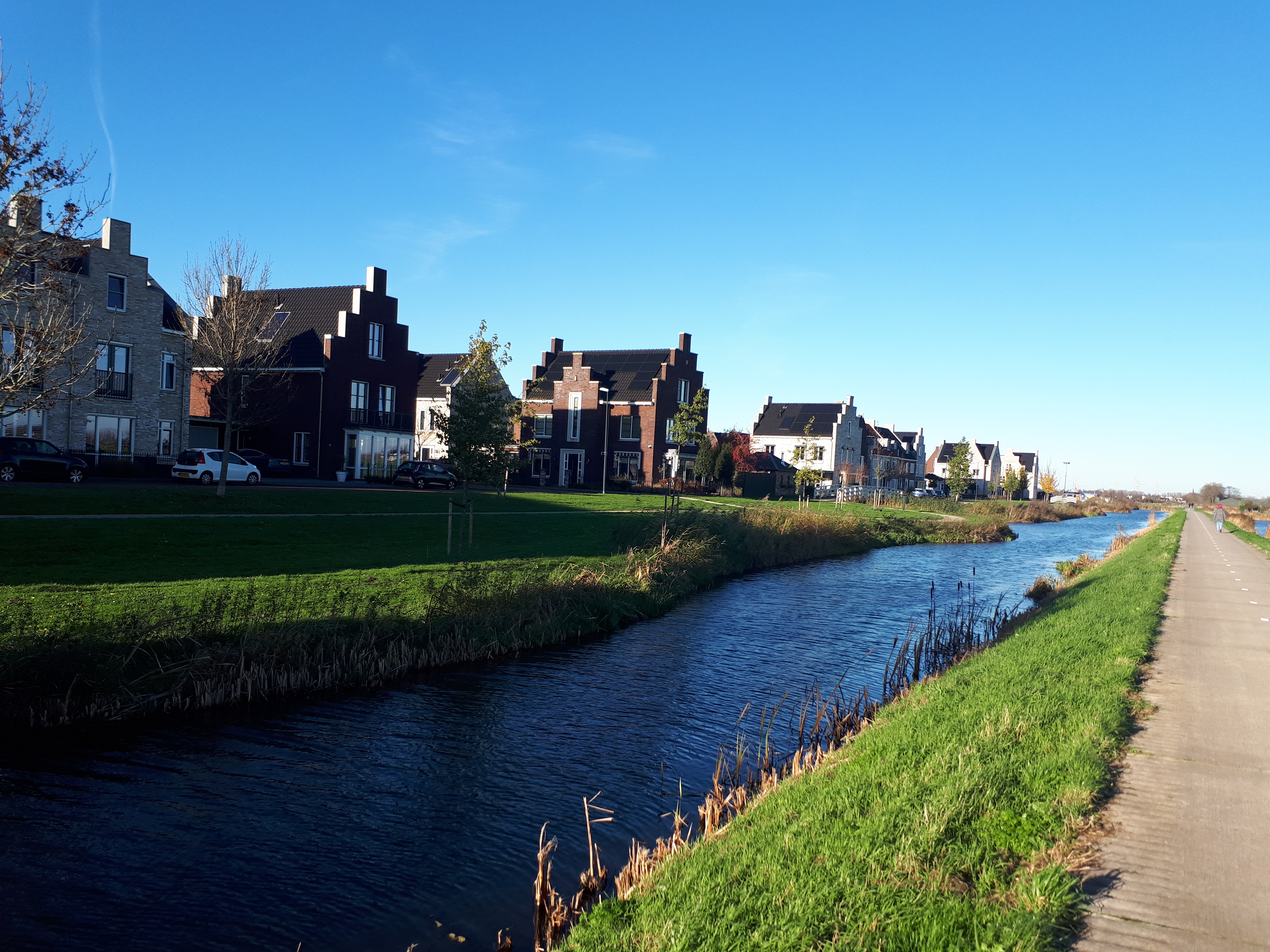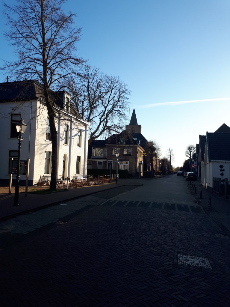 Voor de ware anti-asfaltfundamentalisten is dit klompenpad misschien geen hoogtepunt, ik stoor me er helemaal niet aan. Ik kan zelfs genieten van de dorpsranden waar nieuwbouwwijken verrijzen. Beste aardig wonen denk ik dan over die mooie nieuwbouwhuizen. Niet dat ik ambities heb of hele volksstammen wil interesseren voor een huisje in Bunschoten-Spakenburg, maar het is beste geinig om er langs te lopen op een zonnige november woensdag. Omdat mijn auto niet bij de start stond in verband met corona, had ik de hem geparkeerd nabij de haven. Dat betekende een klein lusje rond de begraafplaats niet gewandeld, maar wel door de hoofdstaat. Dan denk ik wel, wat zal ik gemist hebben? Maar ik heb nu wel een indruk van het overbekende Bunschoten-Spakenburg. Bekend van de visboer bij ons in het dorp, bekend van de voetbal en bekend van het geloof met een variëteit aan kerken, bijna op ieder hoek een kerk.