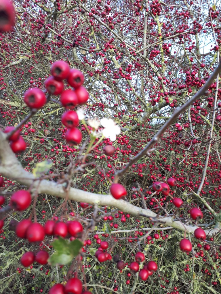 Halverwege komen we lang meerdere meidoornhagen, volgens mij. We zien in de overvloed aan goede besjes een bloemetje die we herkennen als het bloempje van de meidoorn. De vraag rijst bij me, is dit een lui en laat bloemetje of een nieuwsgierig vroeg bloemetje. Met de klimaatverandering kan het allemaal volgens mij. Helemaal op het einde van de wandeling zien we een halve hectare weiland langs de dijk, bijna in het dorp Alem, met veel reliëf zonder dat het slootjes zijn. Waarom? Wat is de reden van het reliëf. Ik heb geen foto kunnen maken want de telefoon was op onverklaarbare reden leeggelopen. Ook dit roept weer vragen op. Ik denk dat ik bij mijn zoons moet zijn voor een verklaring. Het antwoord zal wel zijn dat ik mijn telefoon bijna naar een museum kan brengen.