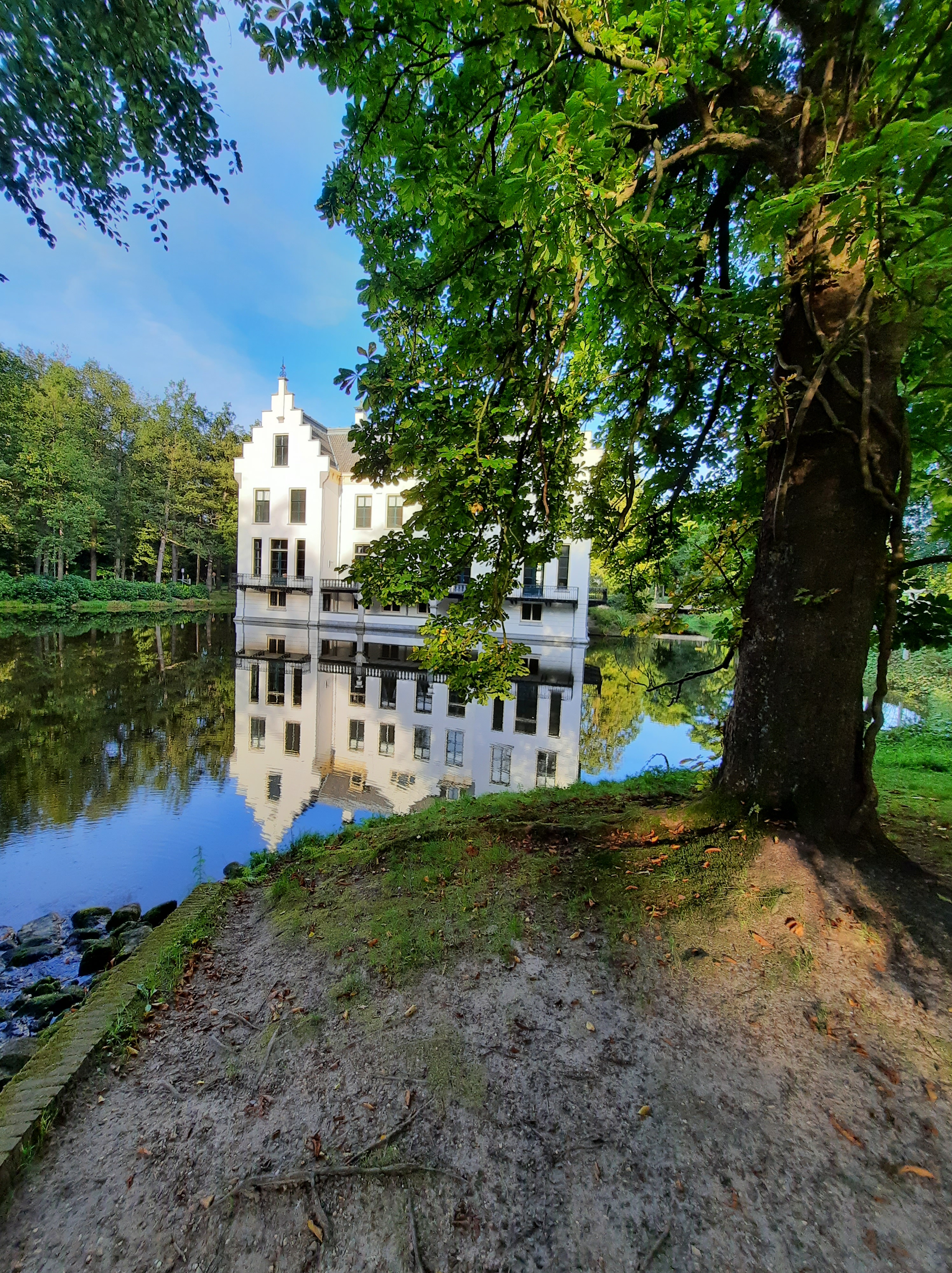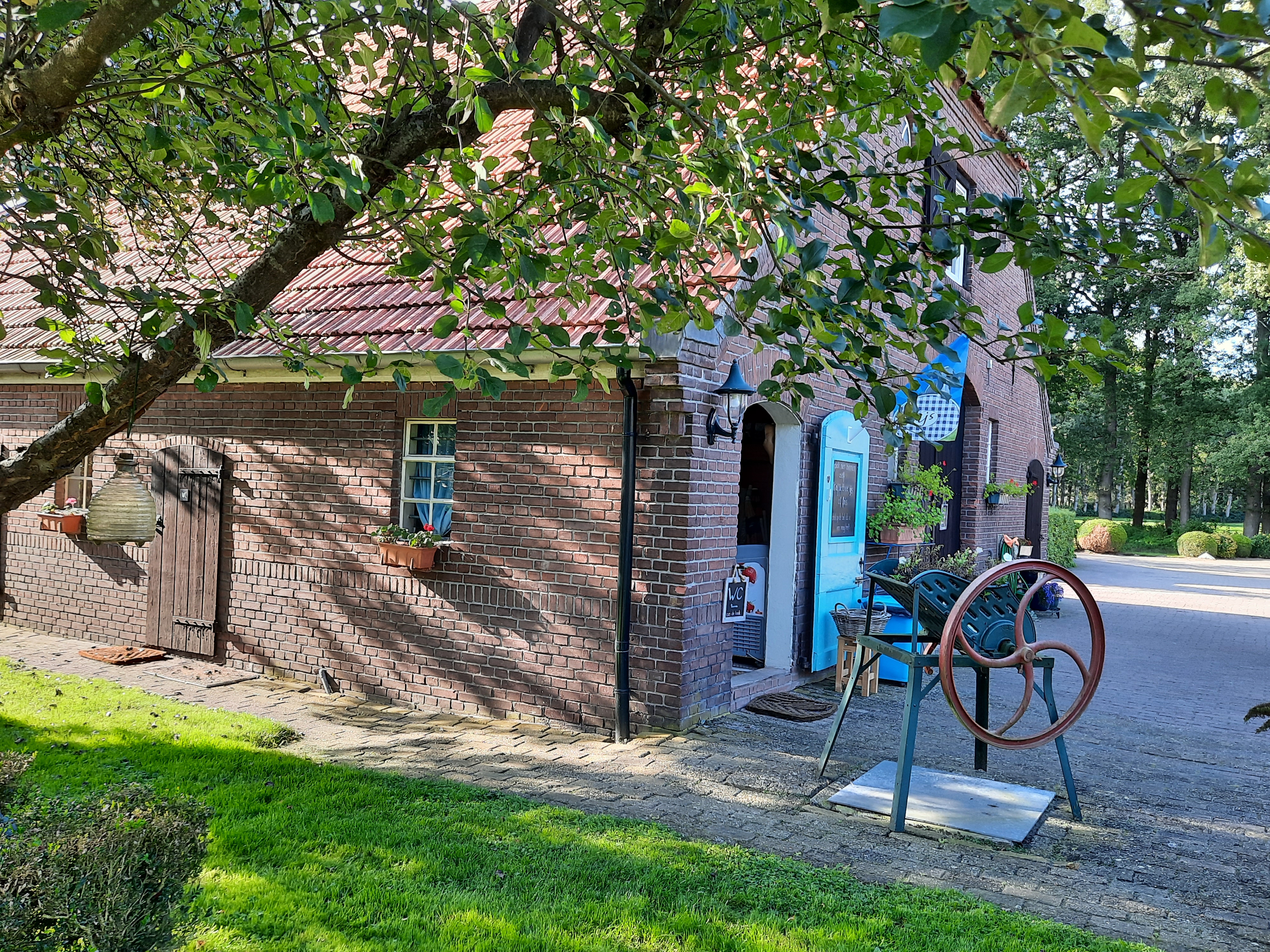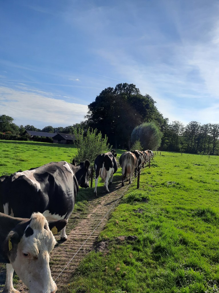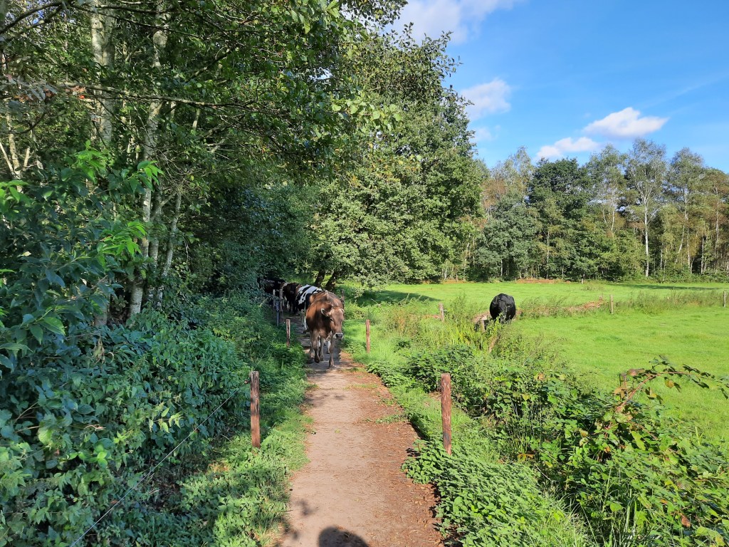 Terug bij het Aardse, of misschien wel hemelse, want de wandeling op het Speuldepad was geweldig afwisselend. Het Solse Gat hebben we niet gezocht, maar heide, bossen en akkerlandschap wisselden elkaar heel mooi af. Voor de liefhebber van meer foto’s van deze wandeling verwijs ik naar mijn Instagram pagina titiissprakeloos. Ze geven een hele goede indruk. Maar de kers op de taart vandaag was geen landschap, maar iets voor de verzorging van de innerlijke mens. We waren al wat koffiegelegenheden misgelopen omdat ze op maandag gesloten waren. Maar Rustpunt Hoeve Kerkenerf was een oase van rust even buiten het officiële pad. Via een koeienpad werden we naar het rustieke erf geleid van de biologische boerderij en konden in alle rust plaatsnemen in de tuin. IJs, koffie met koek, frisdrank en thee waren voorradig, uiteraard zelfbediening. Opgekikkerd door de koffie weer over het smalle koeienpad terug, maar toen kregen we tegenliggers. Een optocht van dertig prachtige koeien liepen ons tegemoet. Met gepast respect kropen we even onder de omheining om de optocht te aanschouwen. En met ons in de wei waren het de beesten die een uitje hadden om ons te aanschouwen. We spraken, toen de laatste koe richting de melkstal kuierde, met de boer over zijn bedrijf en de prachtige omgeving. Als we het Speuldepad als een overheerlijke taart beschouwen dan is dit rustpunt met de koeien toch echt wel de spreekwoordelijke kers op die taart.