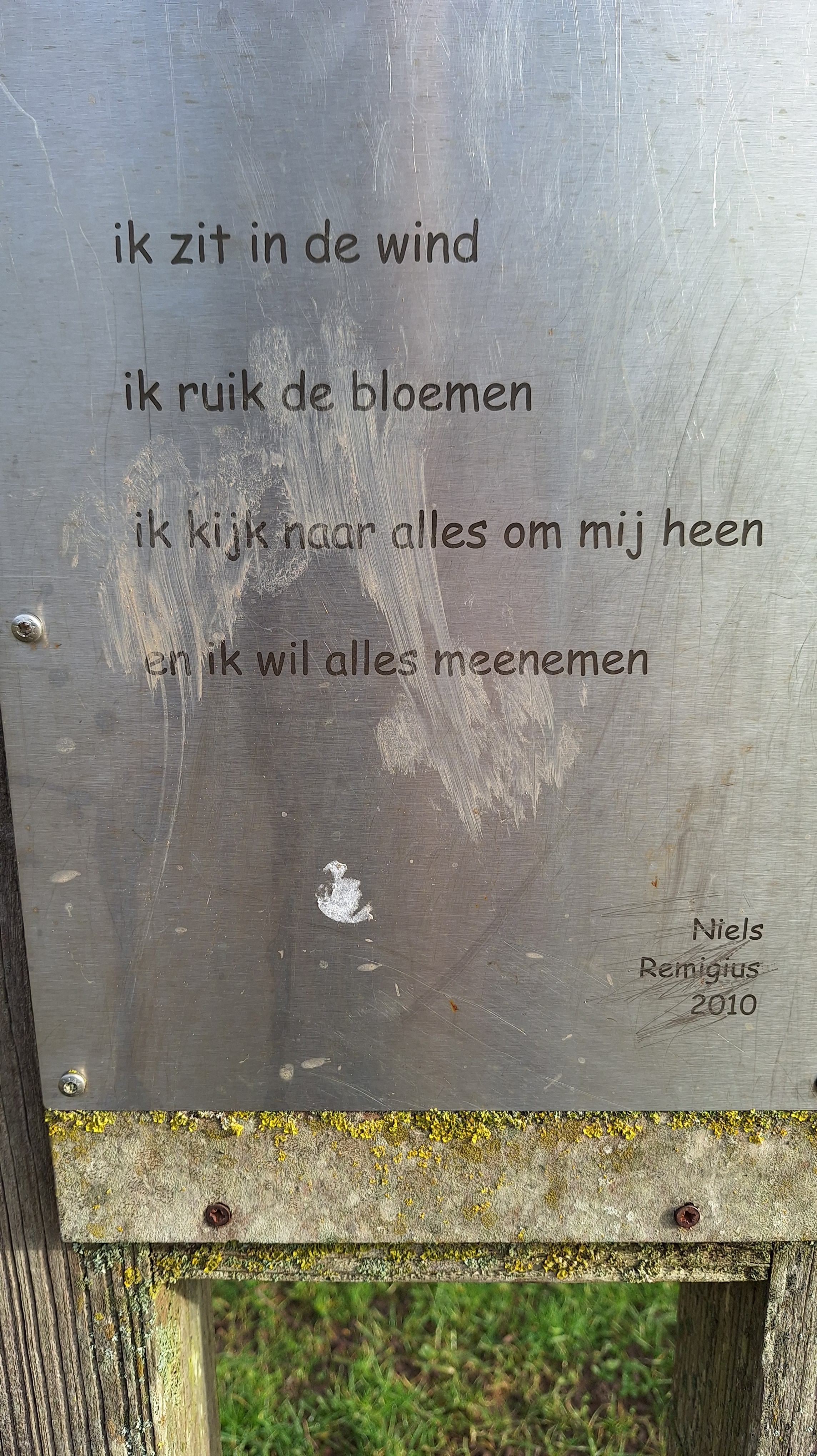 De woensdag ligt nog voor me. Ze weet nog niet of ze zonnig gaat worden of toch andere plannen heeft. Zelf heb ik mijn afstreeplijstje voor de ochtend al op orde. Paspoort vernieuwen, boodschapje en 10.000 passen voor lijf, leden en mind bijna gelopen. Het is half tien en ik word geconfronteerd met een heel optimistisch gedicht in het park. Een gedicht van Niels: