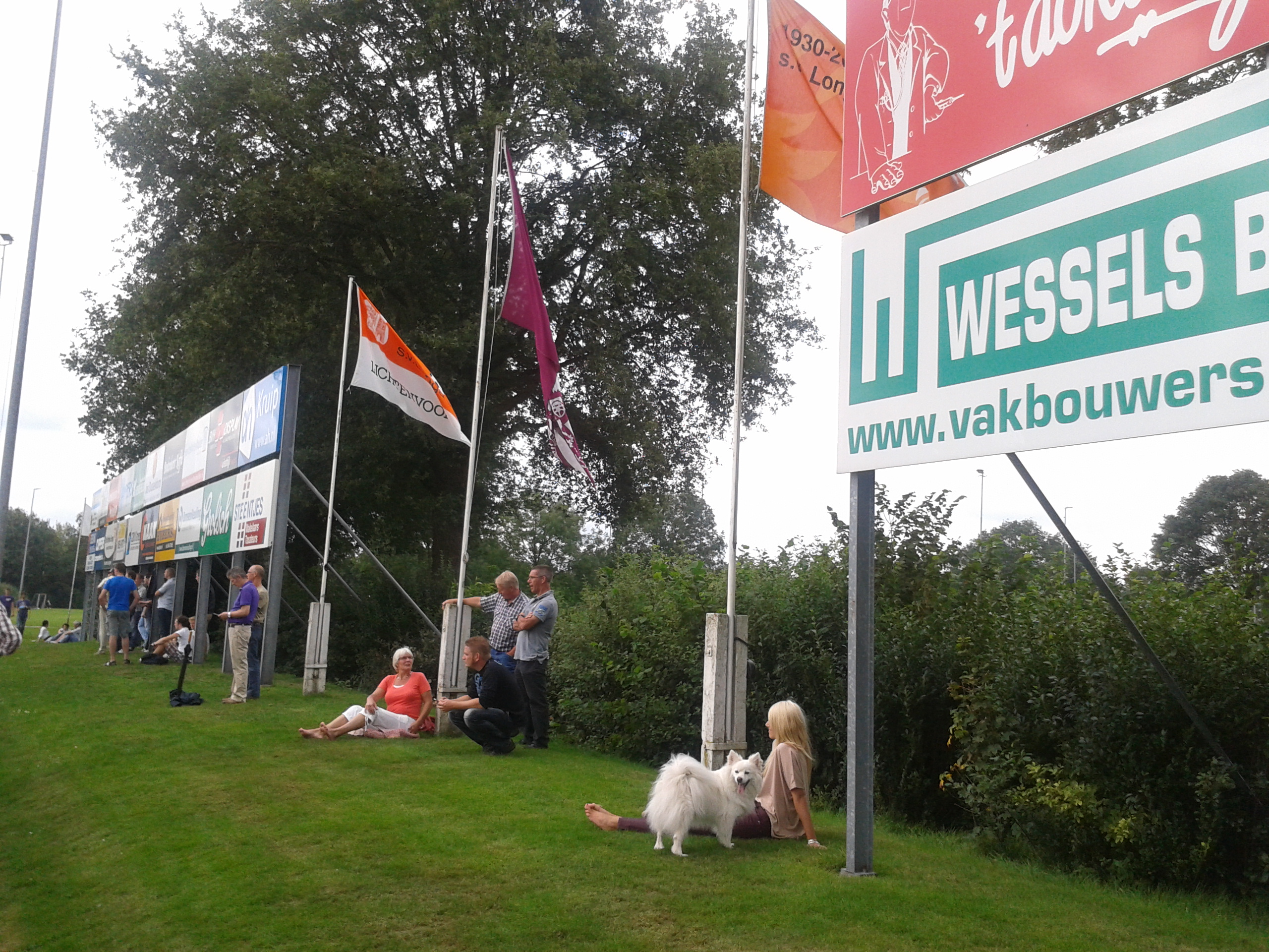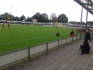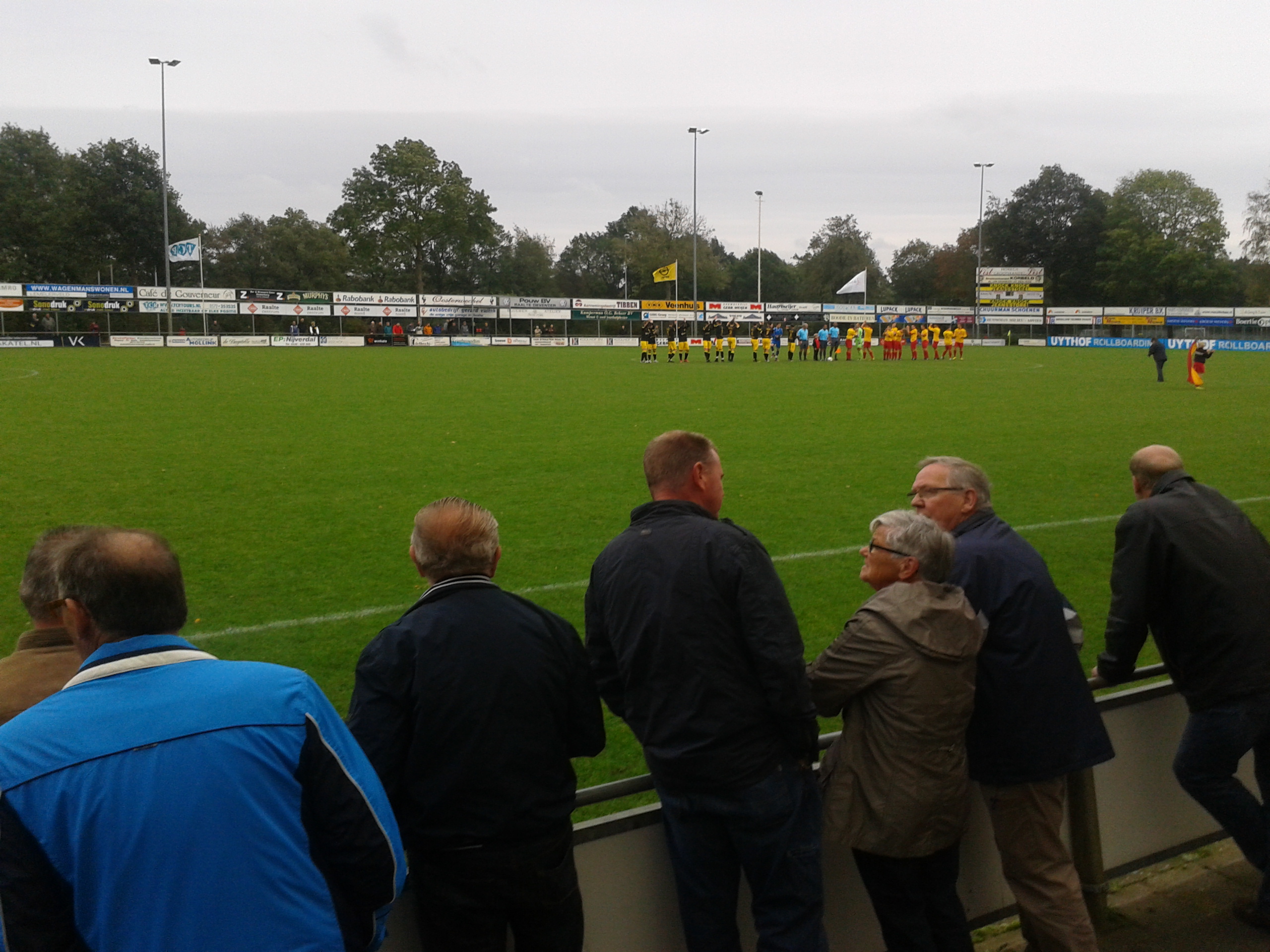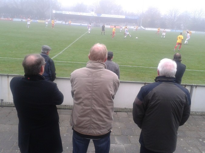Voor mij gaan drie heren staan, die een onvervalst Sallands accent hebben. Volgens mij is één van hen ook nog het zenuwcentrum voor de sociale media, want standen werden telefonisch doorgegeven. Ik heb de gehele eerste helft geluisterd naar hun commentaar. Volgens mij begrepen ze het spelletje wel. Ik ken ze niet, maar ze zullen zichzelf wel op de foto herkennen.