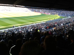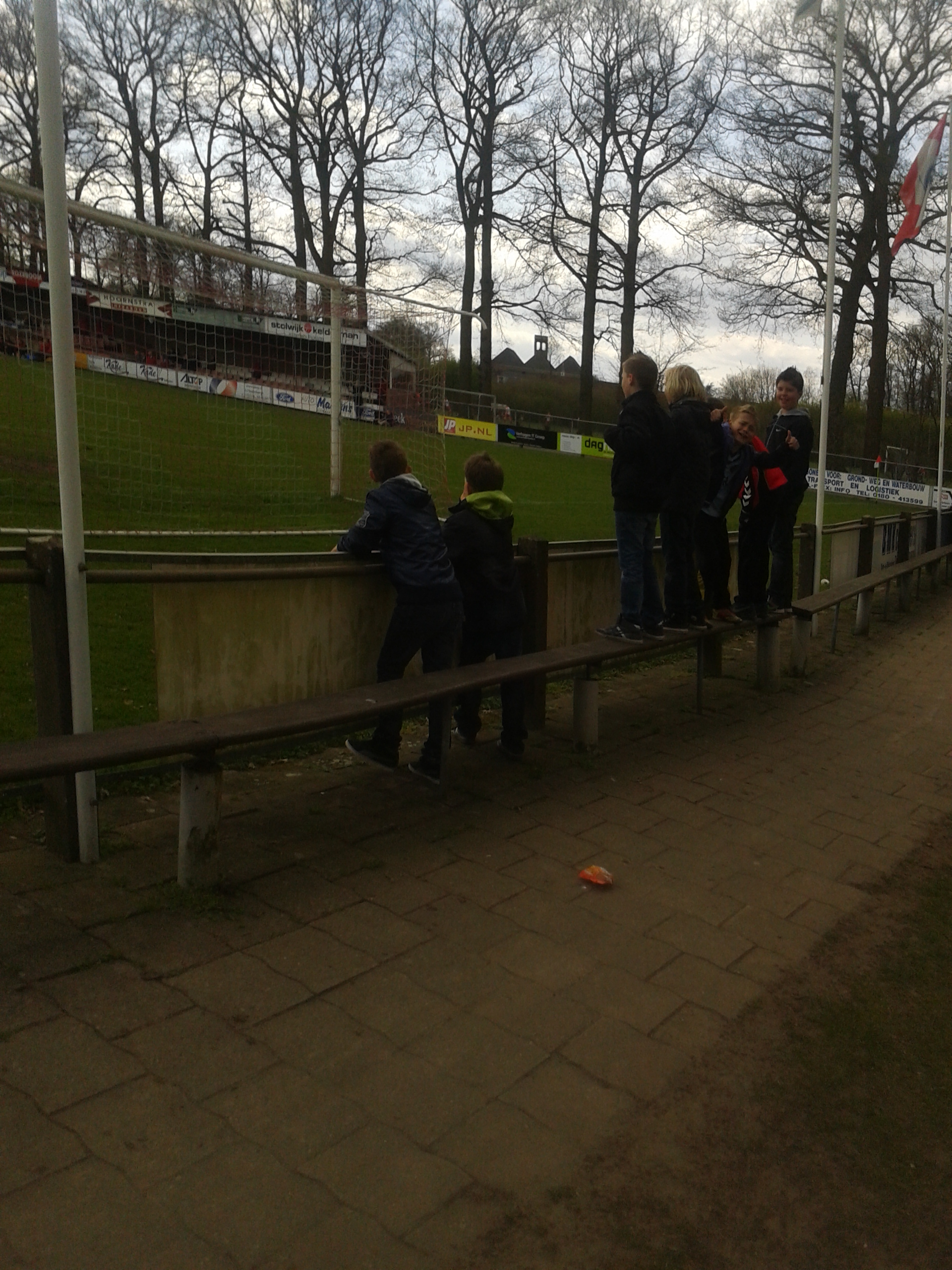 Bij aankomst kopen we uiteraard een programmaboekje, eentje te vroeg blijkt, want het winnende lot valt op het boekje na ons. We lopen meteen naar het staangedeelte van de tribune aan de linkerzijde van de zitplaatsen. De spelers lopen zich warm, pupillen met vlaggen eveneens en André Hazes zingt over ‘Bloed, zweet en tranen‘. Dat moet ook zeker gelden voor de pupil van de week, Simon Veenhuis. Hij dribbelt net als alle andere pupillen die ik gezien heb heldhaftig naar het doel, schrikt zich te pletter van de keeper, maar gelukkig weet hij in de rebound toch te scoren. En dan……