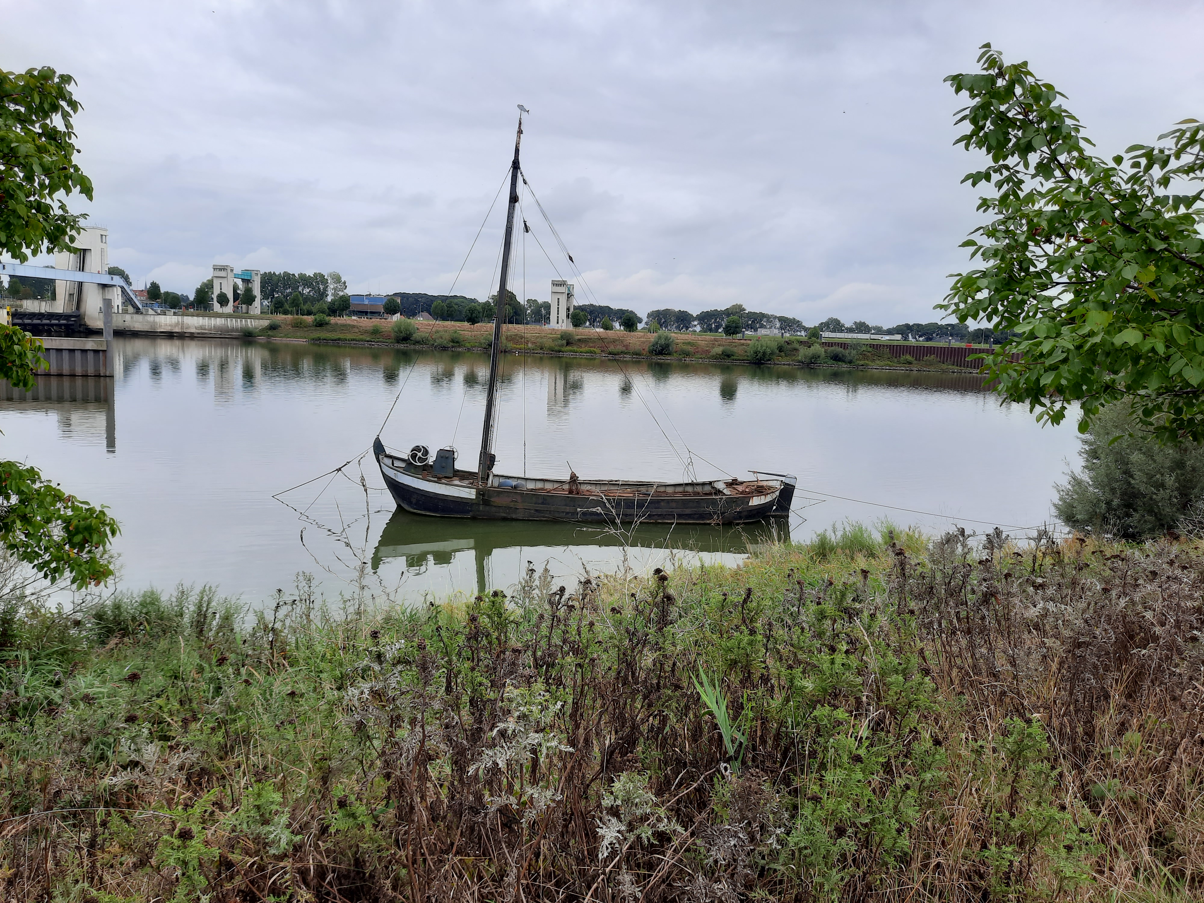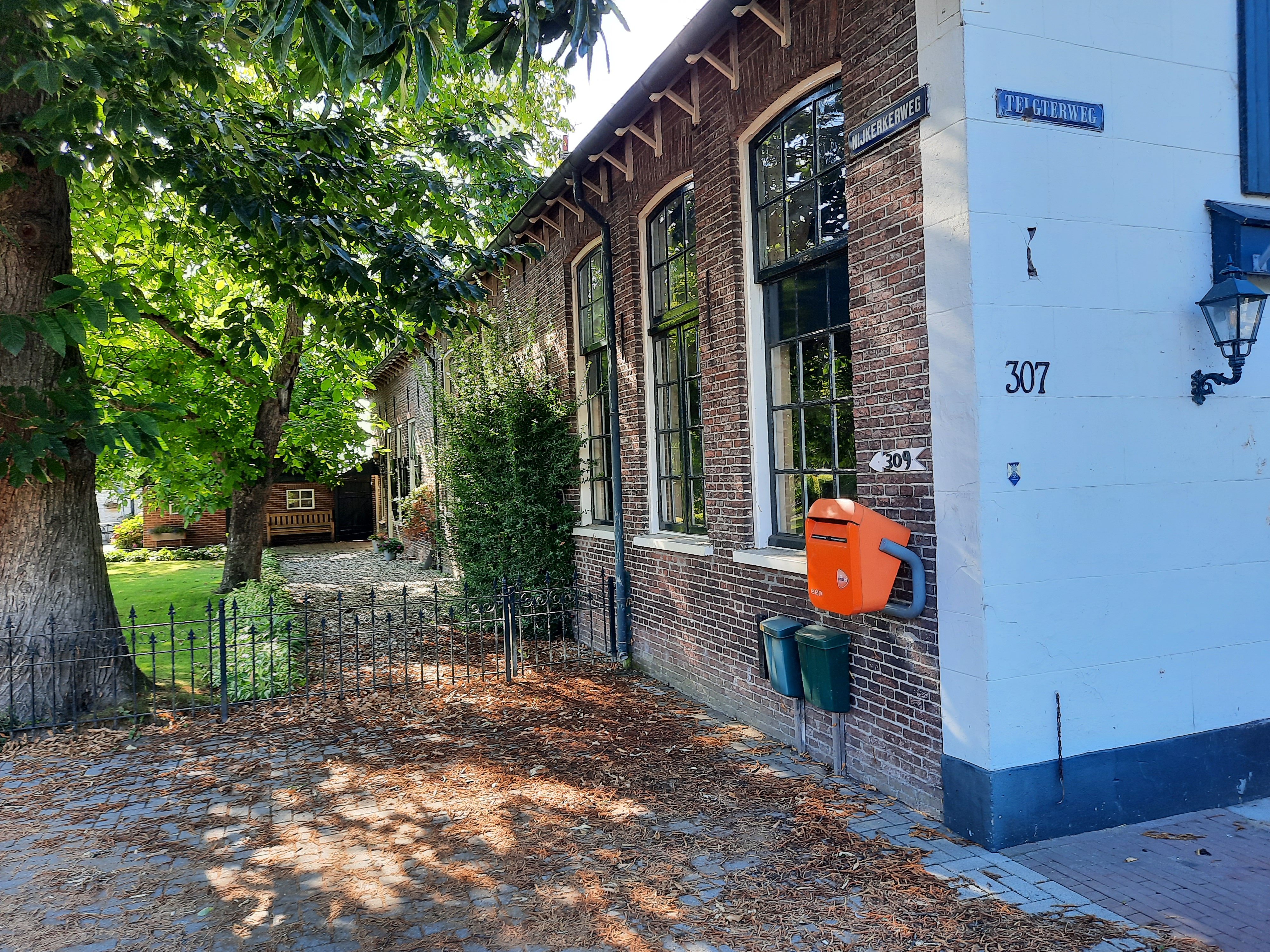 Ga ik vandaag wel of niet werken? Het werd een bietje werken. De weersverwachtingen waren onzeker en ik wilde wel met een goed gevoel de laatste zomerse wandeling maken. Na vele wandelingen in tropische omstandigheden dit jaar, hoopte ik nog op een soort van zomerse dag. Misschien vanmiddag, dus eerst maar een paar uur thuis werken, dan kan ik de vrije uren elders wel een keer inhalen. Om 12 uur gokte ik erop dat ik niet nat zou regenen, of in ieder geval niet meer dan een bietje. Heb ik de zon deze middag gezien? Ja, een bietje. De wandeling was in Alphen (Gld), dat wil in de praktijk dus zeggen: een dijkdorpje, de Maas en jawel, een wetering, fruitbomen, uiterwaarden en plukjes historische gebouwen. Eigenlijk was het Moas-Wetteringpad van alles een bietje. Dus een aangename wandeling maar dat is afhankelijk hoe je het bekijkt: of je uitgaat van alles of toch van een bietje? Is het glas half vol of half leeg? Het begon in ieder geval bij de lokale winkel/horeca-gelegenheid ‘Bij van alles een bietje’ met een cappuccino en appelgebak met appels uit de omgeving. Het gebak was trouwens geen bietje moet ik stellen als veelvraat. Een leuke winkel/horecagelegenheid. Op een op andere manier zorgt het voor leven in de brouwerij.