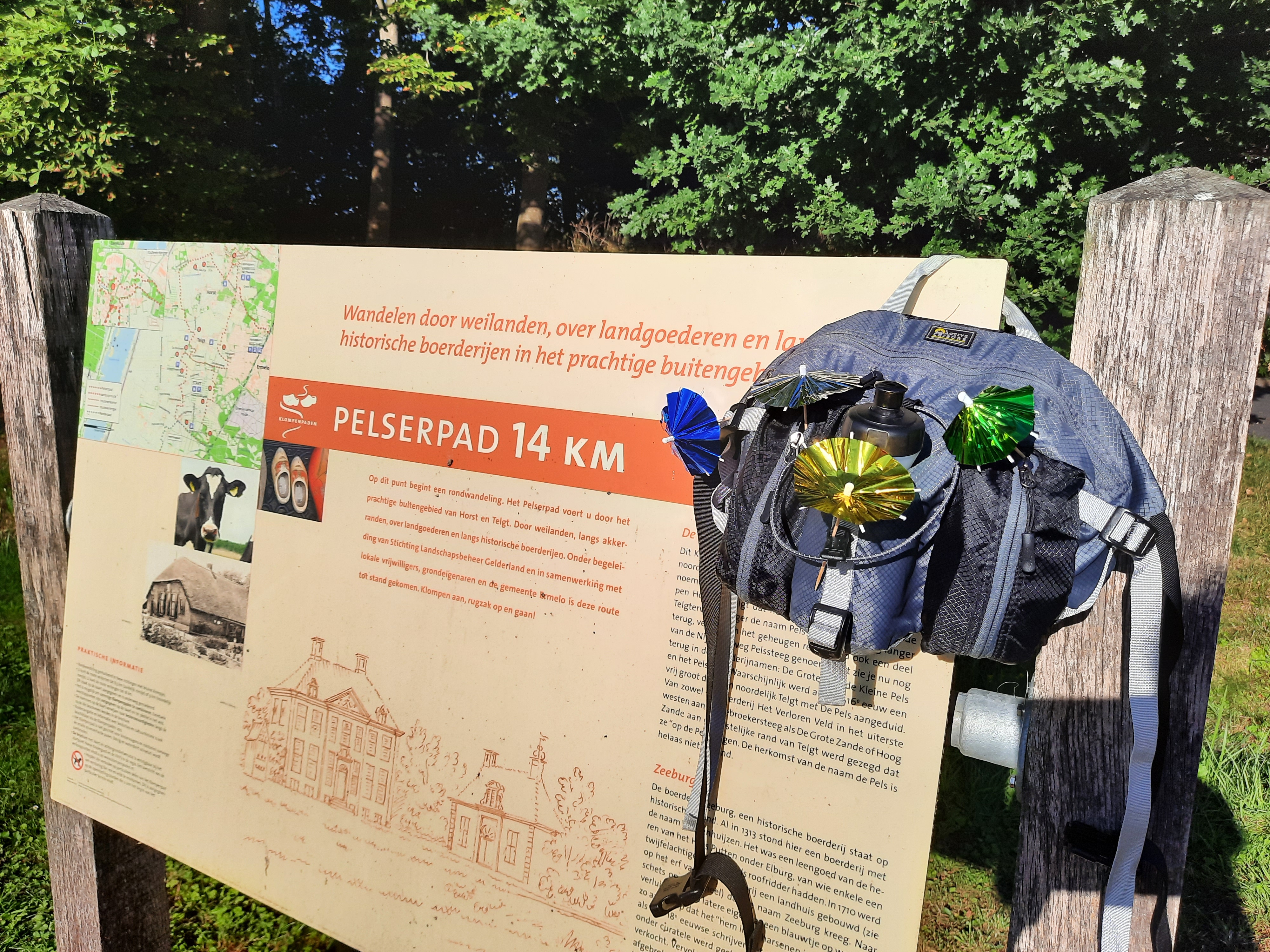 Vandaag was het zo ver, mijn 100e klompenpad in de ideale omstandigheden gelopen met mijn vrouw. Het Pelserpad was bovendien een erg aangename wandeling weten we nu, dus inwendig is het een feestje geworden met een heerlijke schnitzel na afloop in Ermelo, over inwendig gesproken! Maar moet iemand dat aan mij zien? Ik heb geen slingers meegenomen om het heuglijke feit te benadrukken. Tegenwoordig mag dat niet misschien niet meer in verband met milieuoverwegingen. De stikstofwaarde van slingers is me volledig onbekend trouwens. Onderweg hingen er wel heel veel vlaggen en ik had net kunnen doen alsof deze voor mij waren Maar u weet wel beter.
