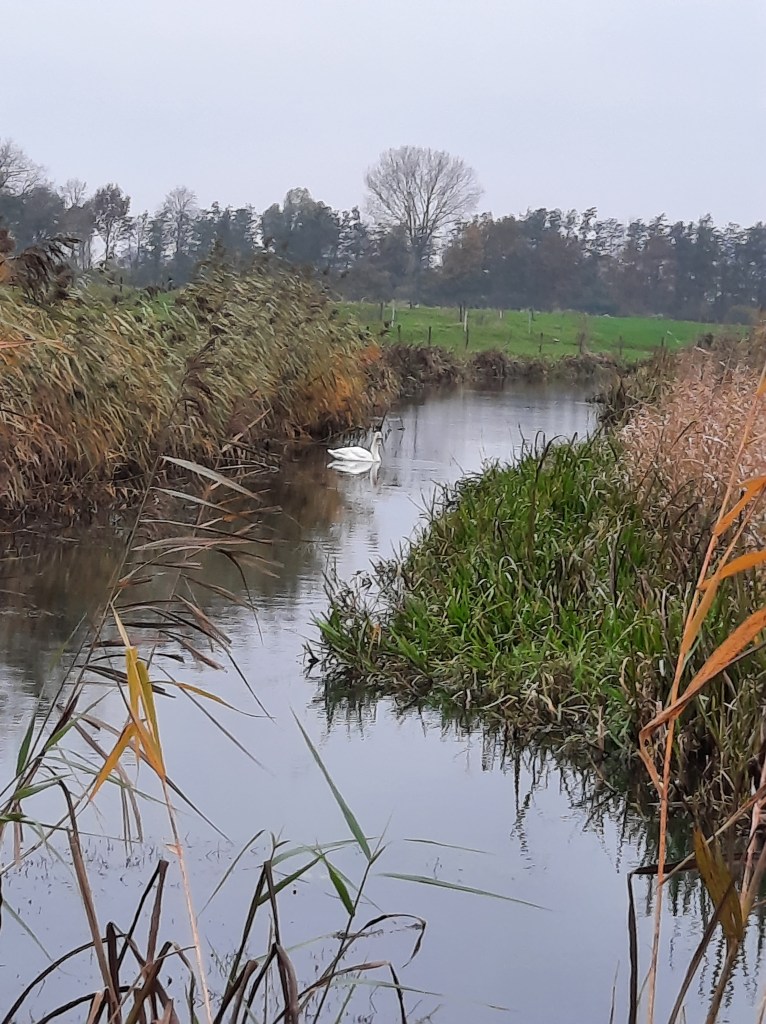 Niet alleen wij genoten van de stilte, maar ook een solitaire zwaan was naar binnen gekeerd in een van de sloten. En omdat zwanen vooral in koppeltjes leven, denken wij dat het om een jonge zwaan gaat die als de winter voorbij is op zoek gaat naar een levensgezel(lin). Hij of zij is moed aan het verzamelen volgens ons.