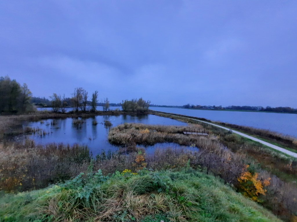 Maar aan het einde van de wereld was er wel een wereldse cappuccino te koop bij De Hut op de grens met Duitsland en geweldige pepernoten. Dat dan weer wel. Die pepernoten zorgden ervoor dat de stilte onderbroken werd door mij, maar alles heeft zijn prijs en ik moest ze ‘helaas’ alleen opeten. De desolate sfeer werd nog versterkt door het feit dat het rond vier uur toch merkbaar donker werd en om vijf uur daadwerkelijk donker is. Gelukkig hebben we nog wel een heldere blik kunnen krijgen van de herinrichting van het zandwinningsgat Carvium Novum.