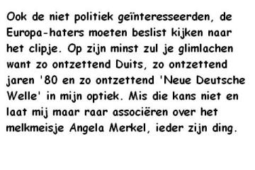 Merkel is een beetje het melkmeisje van Europa. Ze melkt de Grieken tot de laatste druppel uit en danst over de arme Griekse Paupers. Zo wordt ze gezien door de Grieken en mogelijk ook door andere Zuid-Europeanen. Ik vind dat ze, in weerwil van allerlei nazi-vermommingen, vooral een heel vlijtig en ingetogen politica is. Toegewijd aan de Europese zaak. En zoals gezegd, mijn economische kennis schiet te kort, maar voor vandaag is Angela mijn melkmeisje, zo is het toevallig ook nog eens een keer.