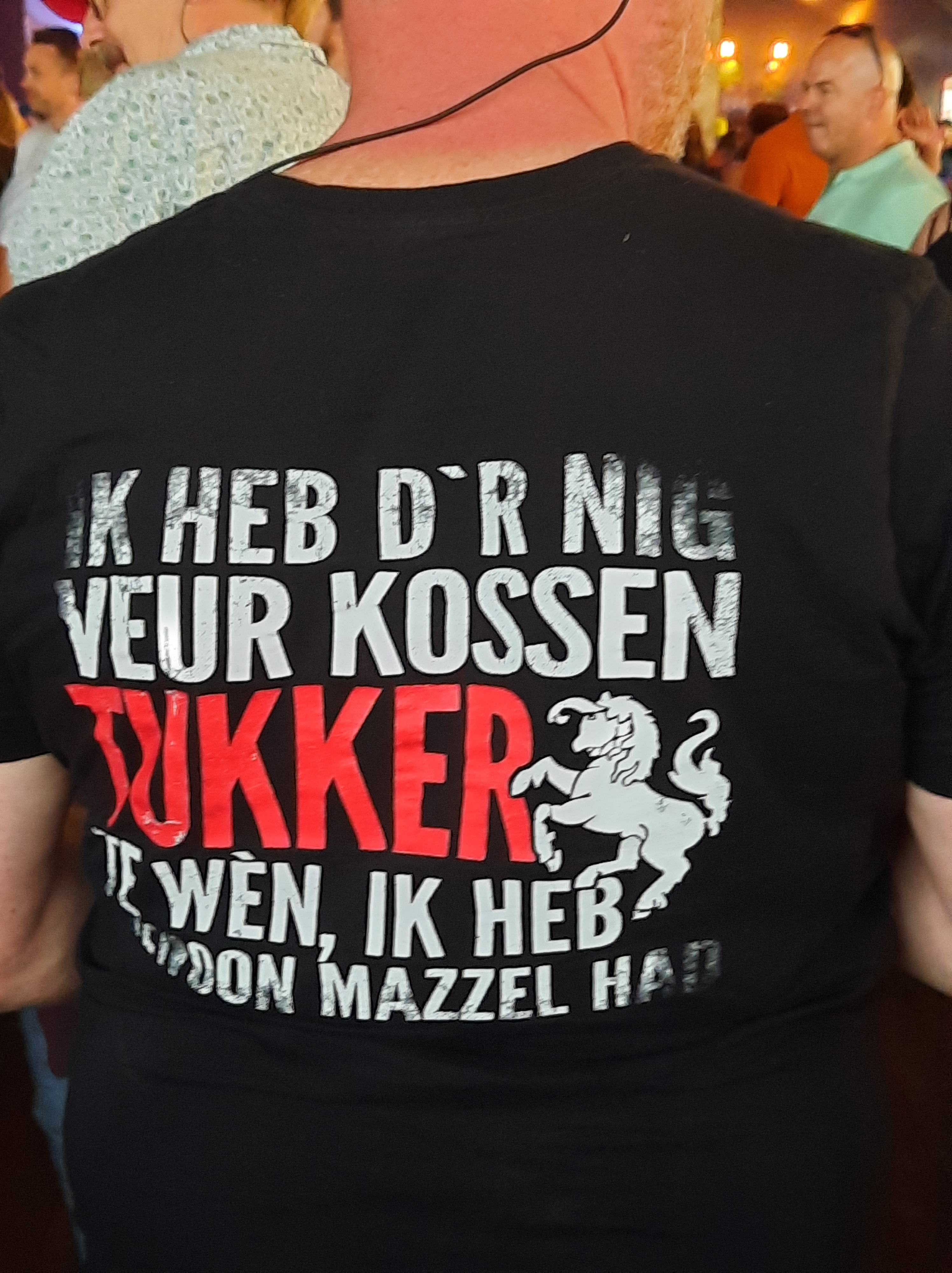 In dit thuisgebeuren was het eerste dat we zagen een band De Ponders. Jordanese Levensliederen op een reggaebeat, een geniaal concept. Stukjes race meegepakt en slenteren, toen we onverwacht werden geconfronteerd met Drukwerk. Jaren niet meer aan Harrie gedacht (sorry Harrie) maar veel liedjes kwamen als vanzelf weer boven. Tussendoor lopen over het immense terrein (24.000 passen gemaakt) hier en daar stilstaan en even kijken. De planning voor de avond was Danny Vera, De Heinos en Dropkick Murfys. Danny was goed, De Heinos betekende met Normaalnummers feest en toen werd het tegen elf uur. Op aanraden van mijn zoon naar de Dropkick Murfys, maar we waren moe na 12 uur Zwarte Cross. We keken elkaar aan en geloofden het wel. Misschien heel jammer en een gemiste kans, maar het voordeel van thuis welkom zijn: Alles kan, maar niks mot.