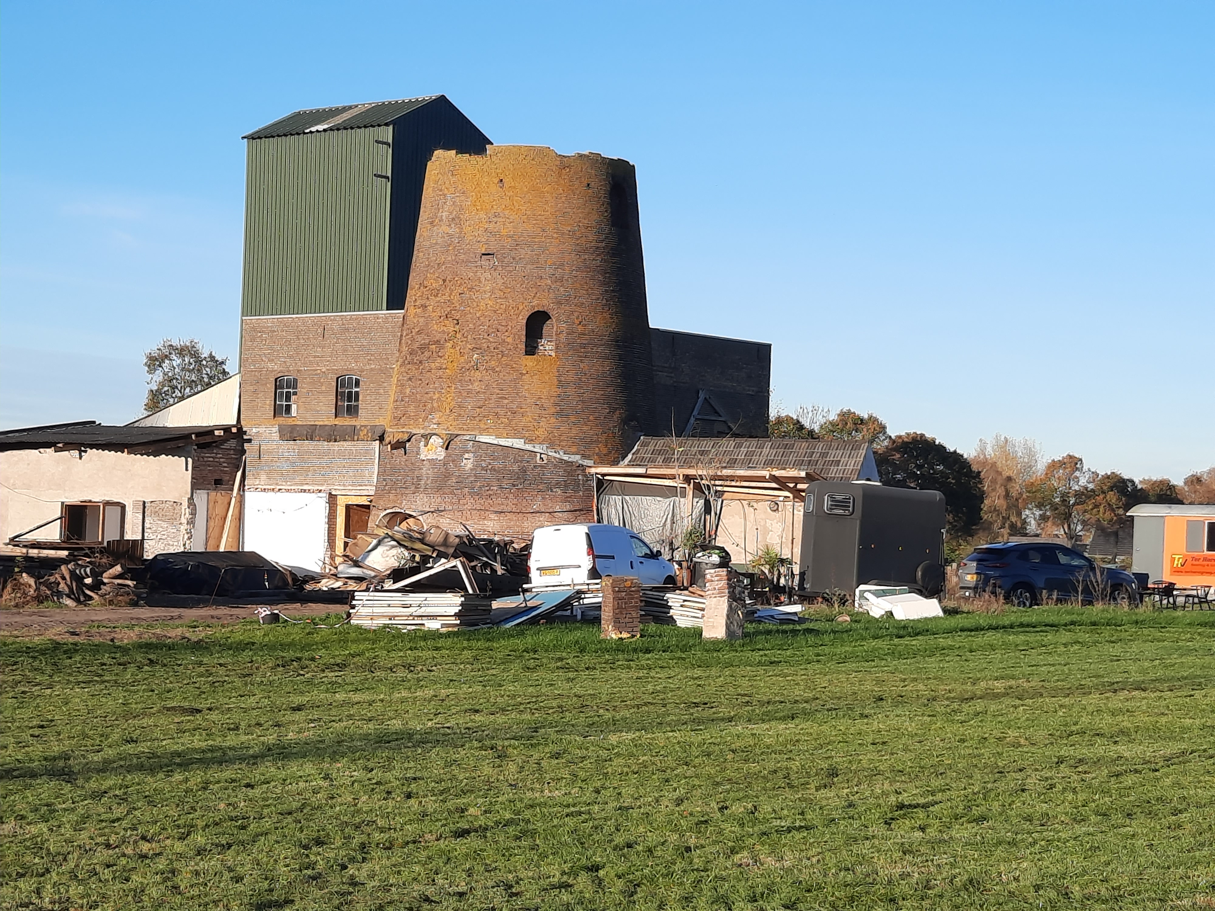 Het gebouw was een oude molen of wat daarvan over is gebleven, met een hele grote groene silo erbij, ook al vrij gedateerd. Even googelen leerde me dat dit de Molen van Bernsten in Loerbeek is. En als het aan de heer Van Huize Bergh had gelegen was de molen er nooit gekomen. Nu, hij kan gerust zijn, de molen is ruim 170 jaar later vervallen tot een soort van ruïne die op mij in ieder geval aantrekkingskracht heeft. Die wil ik wel van dichterbij bekijken. Ik zou ook best meer van de geschiedenis willen weten, maar dat komt nog wel. Eerst mijn slechte ogen maar compenseren door er op een mooie zondagmiddag naar toe te rijden om wat plaatsjes te schieten. Bovendien hoe ziet Loerbeek eruit? Ik wist het niet, alleen van afstand dat er een oude molen was.