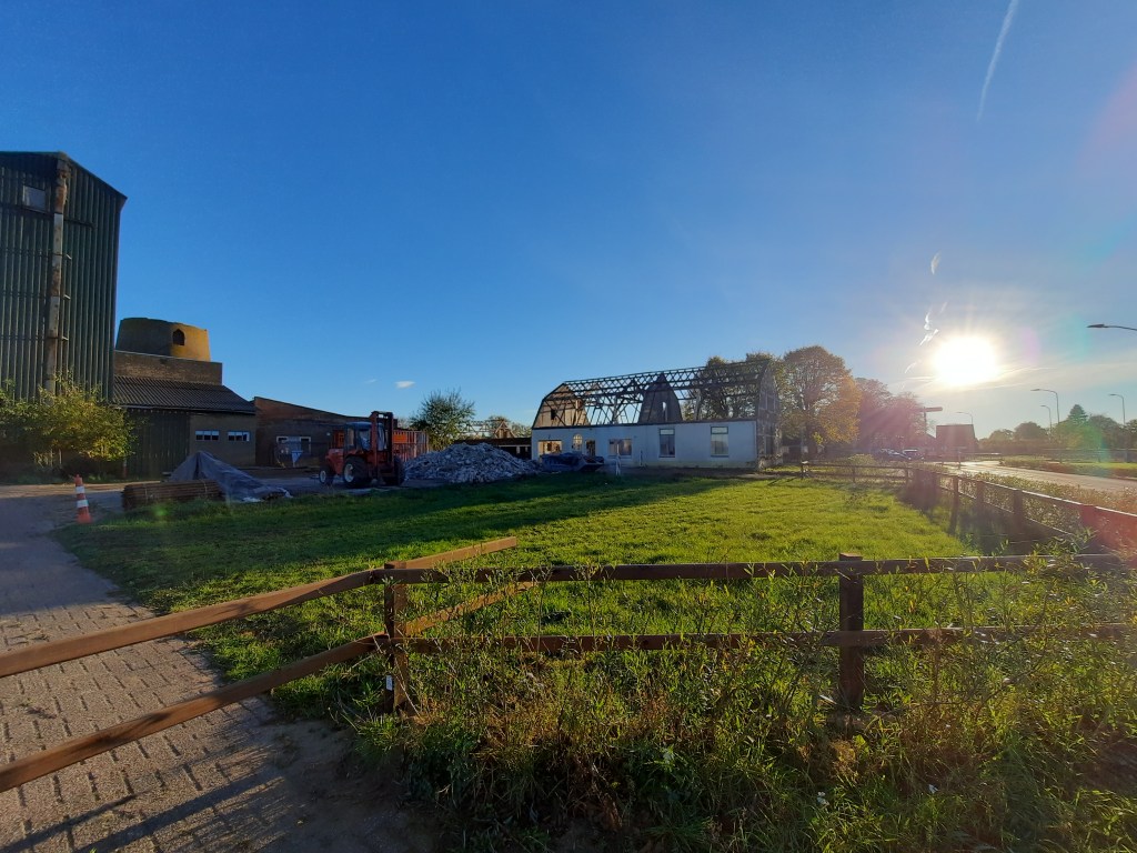 Al fotograferend zie ik mensen aan het werk en één van de werkers ziet mij ook. Ze loopt over het terrein dat met een beetje fantasie ook een 19e eeuwse Havezate kan zijn. Ze komt naar me toe. Bouwmeester Tessa legt uit dat ze er met zijn zessen gaan wonen, allen (aangetrouwde) familie van elkaar. En dat het een klus van een lange adem zal worden. Ik heb er bewondering voor met mijn linkse handen. Ik krijg al buikpijn van de aanstaande verbouwing van (als het goed is) drie maanden in mijn eigen huis. Ik wens Tessa en alle andere bouwers veel succes en plezier met het project. Ik zal het de komende jaren in de gaten houden, in ieder geval een reden om een vaker naar Loerbeek te gaan.