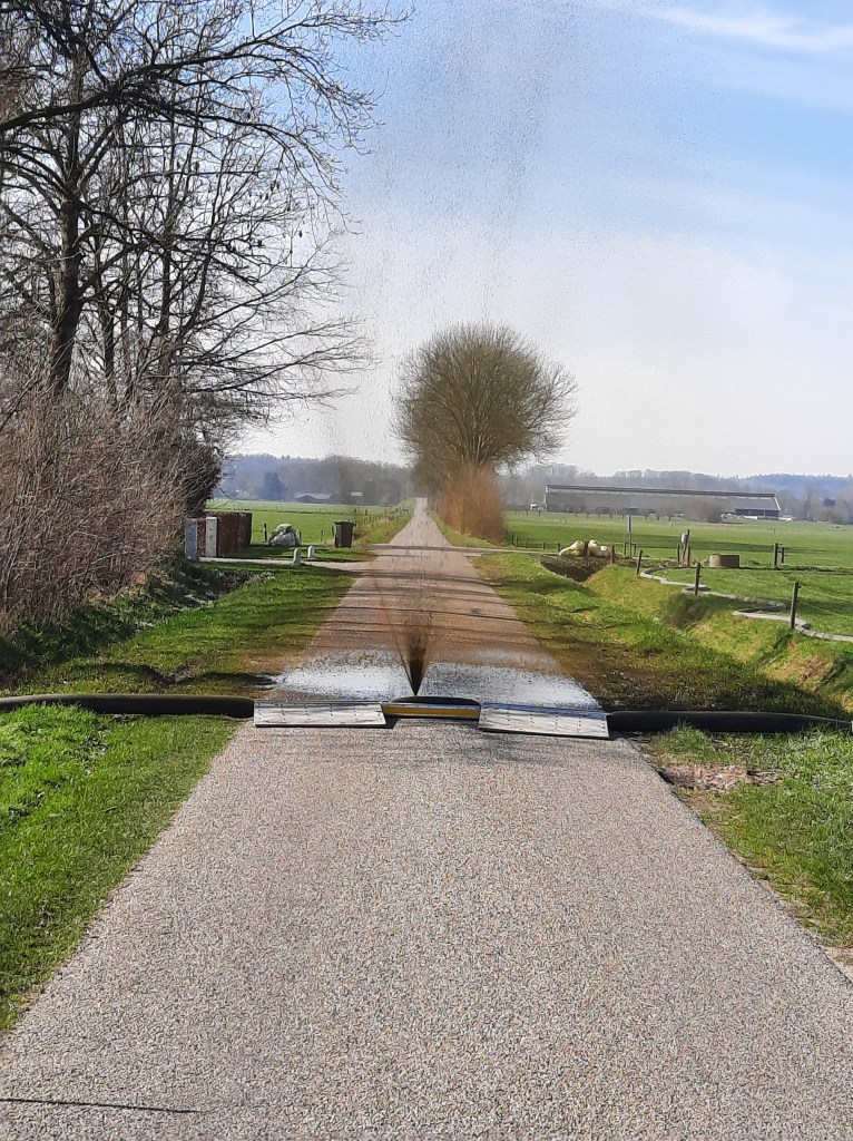 Terwijl ik stevig doorstapte, een Mariakapelletje langs de weg bezocht, zag ik in de verte iets op de straat liggen. Dichterbij bleken dat twee houten schotten te zijn waaronder een grote zwarte buis lag die van het ene weiland naar het andere liep. De auto die langs mij reed minderde vaart en manouvreerde netjes over de planken heen. Het gaf een knalletje, maar ik bedacht me er geen gevaar bij. Ik naderde de buis op een meter, hoorde een hoop gesis en er kwam een gasachtige substantie als een fontein uit. Een gasaanval op een onschuldige wandelaar in Azewijn? Op dat moment was ik heel gelukkig met mijn bovengemiddelde reflexen. In no time was ik op een meter of tien afstand en toen het gas overging in een waterige substantie liep ik nog verder naar achteren. Het waren niet de Russen, het was een boerenaanval. Tot wel zes meter hoog spoot de bruine fontein die ik net ontlopen had. In de verte verschenen de verantwoordelijke landbouwwerknemers die bij de boerderij de druk er afgooide. Nog tien seconden wachten en ik liep er maar snel langs. De aanslag was verijdeld, geen stront op mijn kleding, geen giergas in mijn poriën, dus schoon de auto in straks. Gelukkig maar.