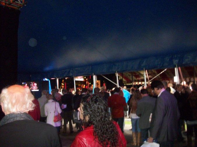 Tijdens het luisteren bedenk ik me dat een fotootje voor het blog ook wel aardig is. Ik ben geen goede fotograaf, maar uit ervaring weet ik dat een beetje kleur het altijd leuk doet bij die zee van letters. Terugkijkend naar het resultaat zie ik dat het in een keer nacht is geworden en de maan is gaan schijnen. Nadere beschouwing leert dat Herman van Veen voor me is gaan staan. Zijn haardracht is uit duizenden herkenbaar en ik neem verder waar dat het een man met een energieke uitstaling is. ‘Ik denk dat hij het goede beroep wel heeft gekozen, die komt er wel.’ Misschien zie ik hem later wel in een van de tenten, zalen of huiskamers in Achlum. Ik heb besloten om eerst naar Mei Li Vos e.a. te gaan.