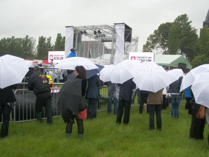Eenmaal op het veld, even buiten het dorp, naast de kerk, komen bijna alle Achlumgangers samen. De witte paraplu’s mogen echter niet mee binnen de afrastering, maar plastic poncho’s worden uitgedeeld. Maar er zijn er niet genoeg. Het wordt dan onbehaaglijk, met alleen een colbert. Ik krijg last van het zogenaamde egaliteitssyndroom: ‘Zou mijnheer Clinton op mij wachten onder zulke omstandigheden.’ Mijn vastbesloten antwoord is: NEE. Ik kijk mijn zwager aan en ook hij lijkt soortgelijke gedachten te hebben. We besluiten, als een van de weinigen te gaan. Misschien stom, maar ach, een slagroomtaart zonder kers is ook heel lekker. Ik heb genoten van de dag en onderweg eten we wel ergens een bordje. Want zo Hollands ben ik niet, dat alles wat gratis is, maar meegepakt moet worden.