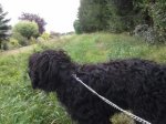We lopen verder, de hond en ik. De hond is zwart en het is donker. Met voldoende zelfkennis besluit ik geen poging te wagen de hond op deze aangename septemberavond te vereeuwigen. Dat gaat niet lukken en dan zult u zich zeker afvragen ‘Wat is dat nu weer?’ Dan worden we opgeschrikt door een hoop gepiep en gebliep en we zien een een rood en een blauwig lichtje. Aan de waterkant, we hadden hem nog niet ontwaart, dat wil zeggen, ik had hem nog niet gezien, mogelijk Pippa wel, maar die had er nog geen aandacht aangeschonken. We bleven beide staan en onder de parasol rees een gedaante. Op onze vraag, gemakshalve ga ik ervan uit dat Pippa dezelfde nieuwsgierige instelling heeft als ik, wat is dit nu weer, komt het antwoord. Ik vraag me wel af wie er nu om elf uur ’s avonds midden in de wijk, waar honden worden uitgelaten en waar het licht van de school brandt, gaat vissen. Goed er is water en waarschijnlijk vis, aan die voorwaarden is voldaan, maar is dit nu echt de rustieke plek om in het holst van de nacht te gaan vissen. Pippa vroeg zich volgens mij niets meer af, ze wilde verder. Maar zo moest nog even wachten op de laatste foto. Mocht u zich afvragen wat dat lichtje aan de rechterkant is. Dat is dus de visser die op electronische wijze werd gewaarschuwd dat er vis onderweg was. De rest van de lichten in de overwegend zwarte foto heb ik reeds verklaard.