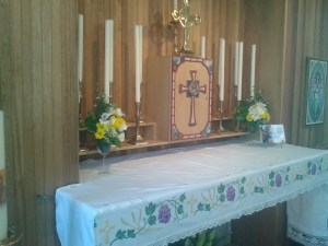Het is voor de meeste mensen altijd even zoeken naar een houding in nieuwe situaties, bij ons binnentreden in het kerkje is dat niet anders. In een flits tel ik vijf mensen in een ruimte waar volgens mij 27 zitplaatsen zijn. We gaan meteen in de eerste bank zitten en kijken mogelijk onwennig om ons heen. Voordat we ons bewust waren van die onwennigheid, kwam een vriendelijke dame naar ons toe met het nodige lees- en zangvoer en werden we wegwijs gemaakt in het abc van de dienst. Een man, waarvan ik dacht dat het de priester was, heette iedereen welkom, om vervolgens opnieuw op te komen, maar dan nu met de echte priester en nog een misdienaar, of eigenlijk misdienette, al weet ik niet of dat van toepassing is in deze kerk.