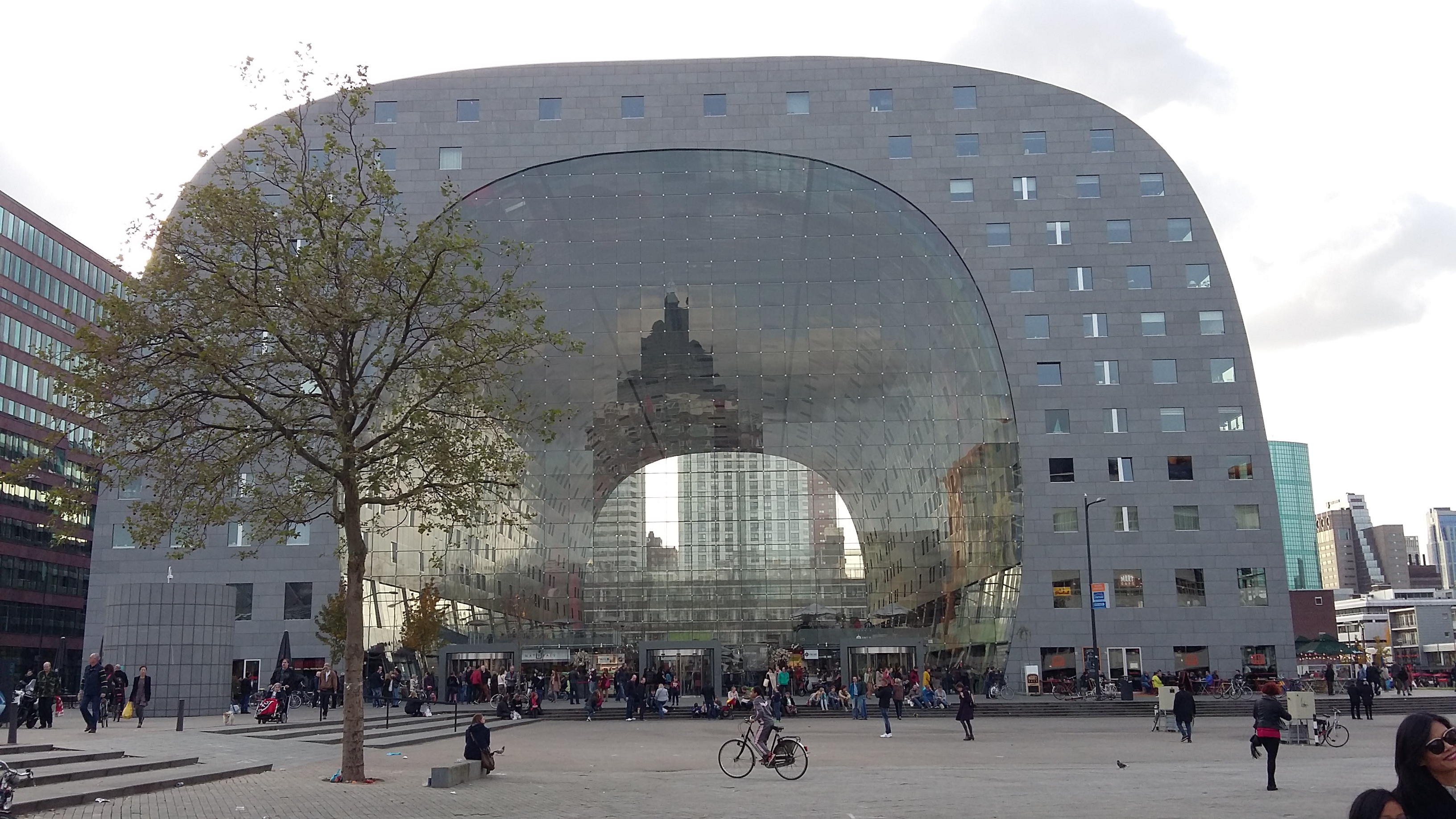 Rotterdam was het tweede doel, de auto in het centrum geparkeerd, trouwens ook indrukwekkend die parkeergaragewereld in het centrum, en dan de koopgoot in. Het doel was o.a. Boymans van Beuningen, maar dat gaat niet met een lege maag. Toen dat probleem was opgelost, was het drie uur en omdat ook de markthallen gezien moesten worden, is voor de tweede keer het museum geskipt. De etenswaren van de Markhallen interesseerden ons niet zo veel want de magen waren immers net gevuld. Maar wat een prachtig stukje Rotterdam. Terwijl de laatste Feyenoorders zich richting de Kuip begaven, genoten we van het uitzicht. Raar trouwens om niet naar de Kuip te gaan, terwijl je wel in de havenstad bent. Aan de andere kant, de meeste Rotterdammers zaten die middag niet in de Kuip. Op de terugweg zagen we de brandende lampen van De Kuip aan onze rechterzijde. Dat moet ongeveer het moment zijn geweest dat Dirk Kuyt zijn derde doelpunt maakte die middag. Was ik er toch een beetje bij. Op 8 november 2015 gaan we het inhalen en zal 020 voor een tweede keer in twee weken op zijn flikker krijgen. Rotterdam met de markthallen, een geslaagde middag en bovendien hebben we ook nog een sjamanentrommel.